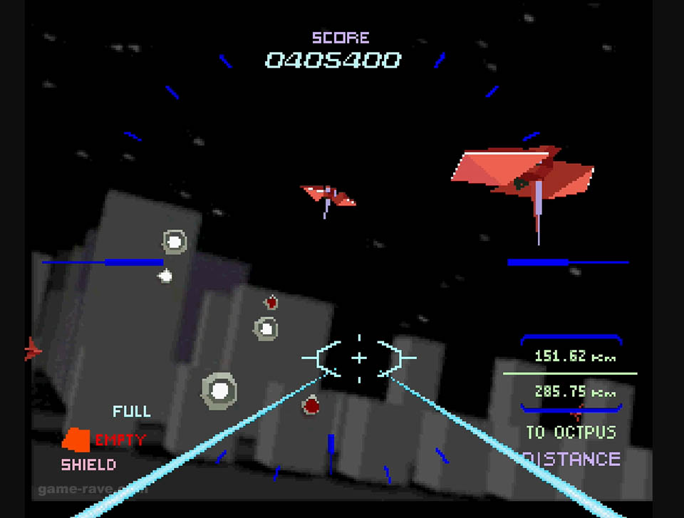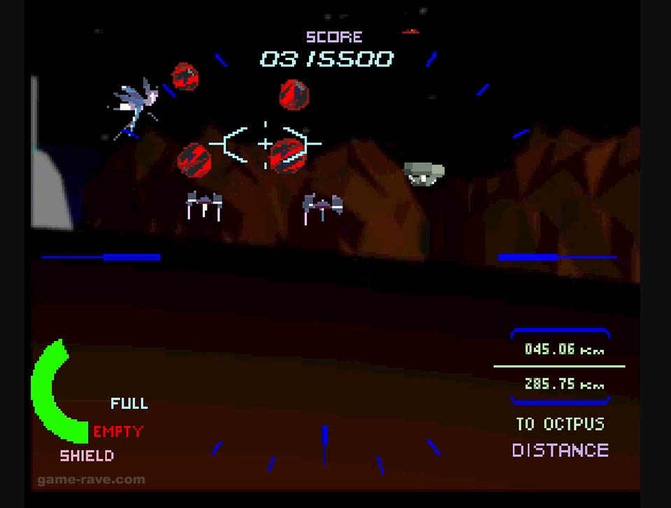 Once past this, it’s a straight suicidal dive down into Red Eye’s trenches and cityscape. Buildings and rock formations infused with laser turrets mercilessly send flak out in every direction. Red Eye’s core, known as Octopus, is close by, and we’ll have to fly into the heart to dismantle it.