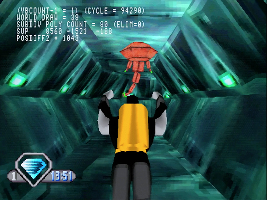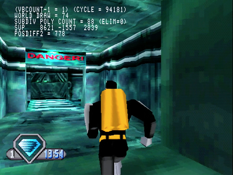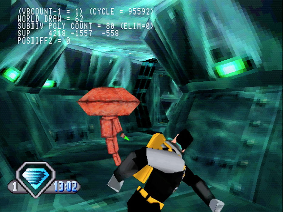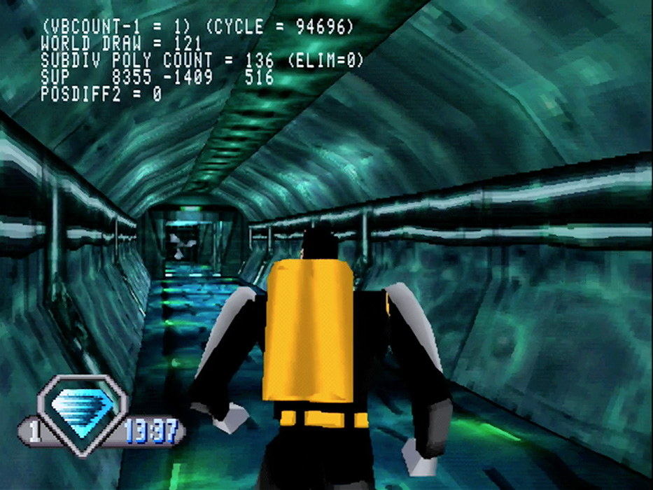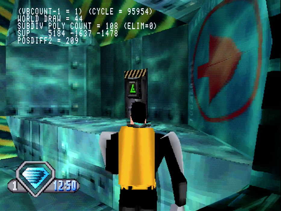 Assumed to be the new version of the N64’s final stage, the prototype build is glitched. Superman can fly around the room, but the enemies and platforms are sunk into the spinning space texture.