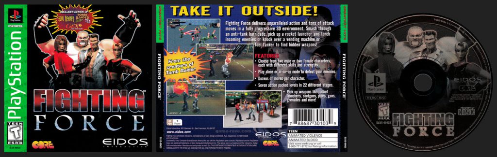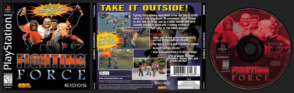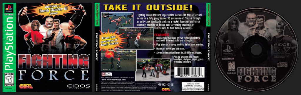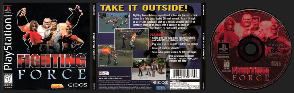Take It Outside! Fighting Force delivers unparalleled action and tons of attack moves in a fully progressive 3D environment. Smash through an anti-tank barricade, pick up a rocket launcher and torch incoming enemies or knock over a vending machine or fuel tanker to find hidden weapons! Features: